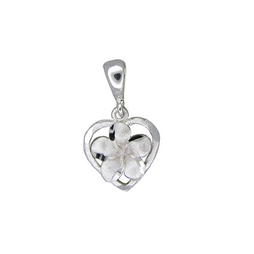 14kt White Gold Hawaiian 8mm Pluemria Heart Pendant. The heart pendant is 3/8" by 3/8" with 1/4" White Gold sand finished Plumeria flower in the center of the white gold heart.