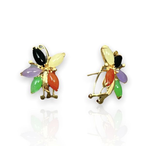 14KT Yellow Gold mixed color Jade 5 Petals Flower French Clip Earrings. 13/16 inch by 3/4 inch with five different color jade stone on it.