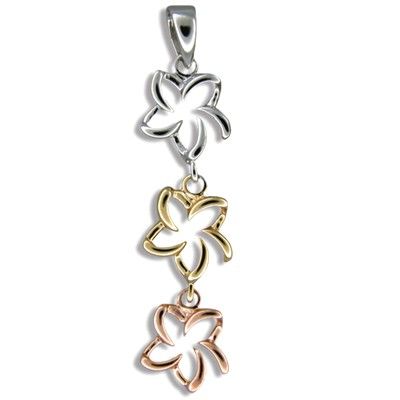 Sterling Silver Hawaiian Tri-color Open Plumeria Pendant. There are three different color Open Plumeria on the pendant. Each Plumeria is 3/8" in diameter and total length is 1 1/2" with Rhodium finished to avoid tarnishing.
