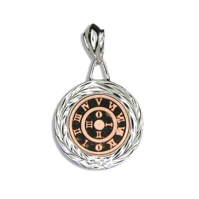 Hand Engraved Fine Sterling Silver Female Maile and Plumeria Design with Double Circle Pendant. The double circle shaped pendant is in 3/4" diameter and has two layers. The bottom layer is finished with Rhodium to avoid tarnishing. Also, it is engraved with Hawaii Maile and Plumeria designs. The top layer is plated with 14kt Rose Gold and engraved with Roman Number.