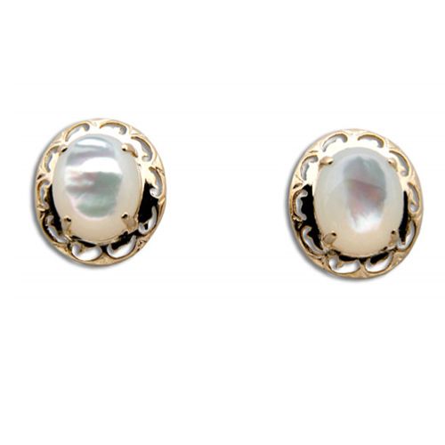 14KT Yellow Gold Cut-In Wave Design with Oval Shaped MOP Earrings. The oval shaped MOP is decorated with 14KT yellow gold cut-in wave design filigree. The earrings are high polished to maintain the quality. Always appropriate and gorgeous, this pair of earrings is a timeless classic.
