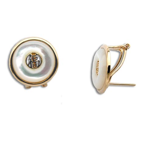 14KT Yellow Gold 'Good Fortune' with Round Shaped MOP (Mother of Pearl Shell) French Clip Earrings. The 14KT yellow gold Chinese character "Good Fortune" is set in the center of the Donut-Shaped MOP earrings. The earrings are high polished to keep them shiny.