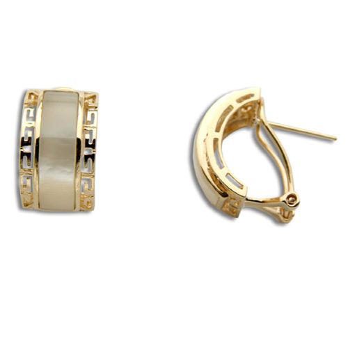 14KT Yellow Gold Cut In Chinese Pattern with MOP (Mother of Pearl Shell) Half-Hoop French Clip Earrings