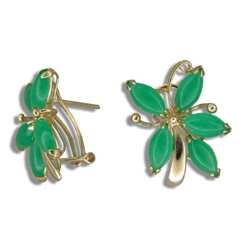 14KT Yellow Gold Green Jade 5 Petals Flower French Clip Earrings