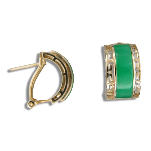 14KT Yellow Gold Cut In Chinese Pattern with Green Jade Half-Hoop French Clip Earrings