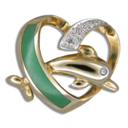 14KT Yellow Gold Green Jade Dolphin in Heart Pendant with Diamond