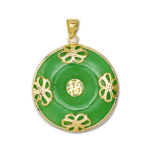 14KT Yellow Gold Chinese Good Fortune Green Jade Dish Pendant
