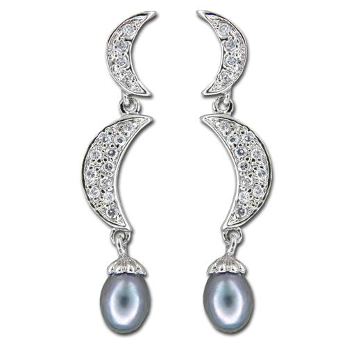 Sterling Silver Double Moon with CZ and Fresh Water Pearl Dangling Earrings