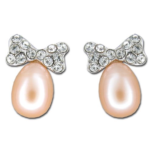 Sterling Silver Bow Tie with CZ and Fresh Water Pearl Post Earrings