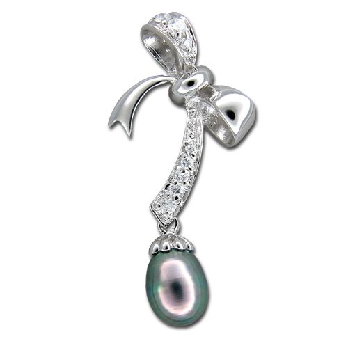 Sterling Silver Bow Tie with CZ and Dangling Fresh Water Pearl Pendant