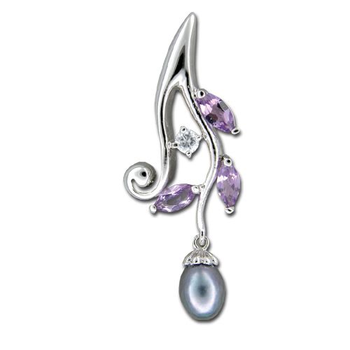 Sterling Silver Falling Leaves Shaped Clear and Amethyst Purple CZ with Dangling Fresh Water Pearl Pendant