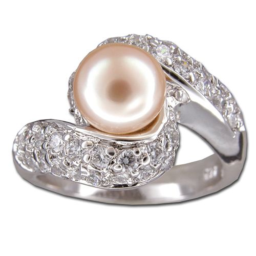 Sterling Silver Double Scroll with Clear CZ and Fresh Water Pearl Ring
