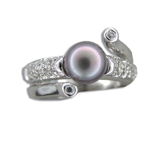 Sterling Silver Fancy Channel Set Clear CZ with Black Fresh Water Pearl Ring