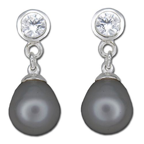 Sterling Silver Clear CZ with Dangling Black Fresh Water Pearl Post Earrings
