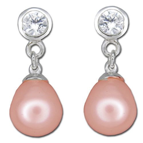 Sterling Silver Clear CZ with Dangling Peach Fresh Water Pearl Post Earrings
