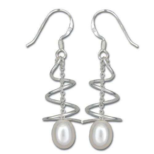 Sterling Silver Swirl and Dangling White Fresh Water Pearl Fish Wire Earrings