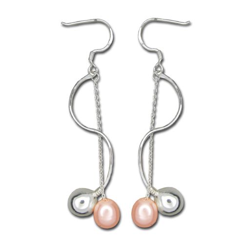 Sterling Silver Wave Design with Long Chain Peach Fresh Water Pearl Drop Fish Wire Earrings
