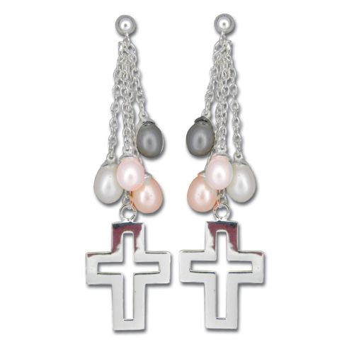 Sterling Silver Dangling Cross with Mixed-Color Fresh Water Pearl Post Earrings