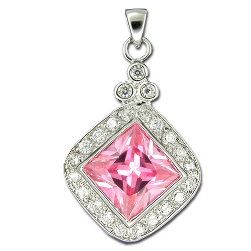 Sterling Silver Square-Cut Pink Tourmaline CZ with Channel Set Clear CZ Pendant