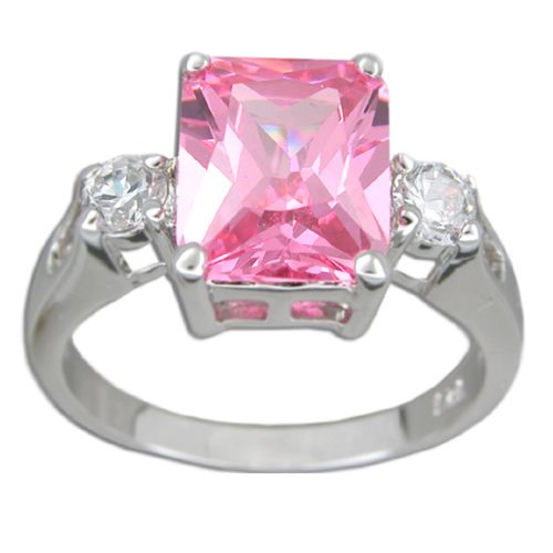 Sterling Silver Rectangular Shaped Pink Tourmaline CZ with Clear CZ Ring