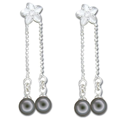 Sterling Silver Plumeria with Dangling Black Fresh Water Pearl Earrings