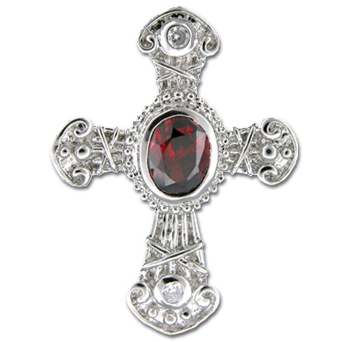 Sterling Silver Antique Cross Design with Oval Shaped Garnet Red CZ Pendant