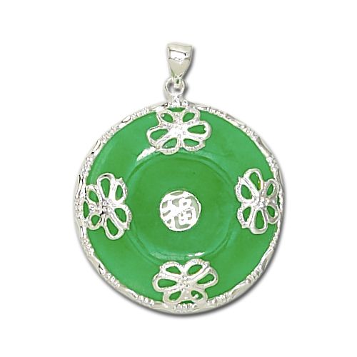 Sterling Silver Chinese Good Fortune Green Jade Dish Pendant