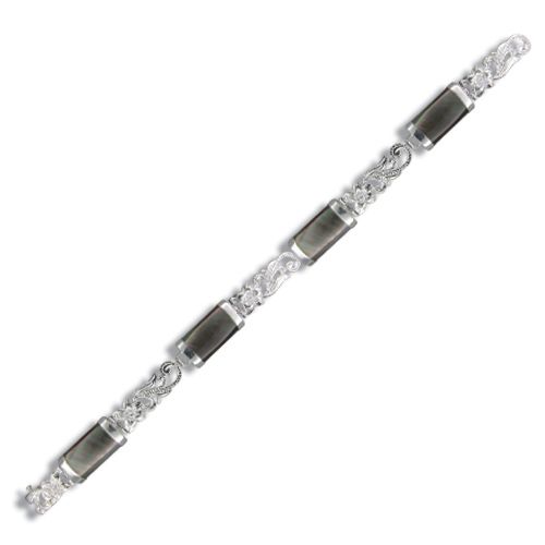 Sterling Silver Hawaiian Plumeria and Scroll with Long Bar Black MOP (Mother of Pearl Shell) Bracelet
