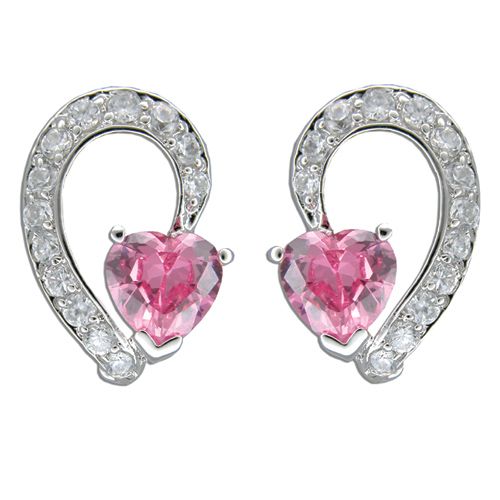 Sterling Silver Half Heart Design with Clear and Pink Tourmaline CZ Heart Earrings