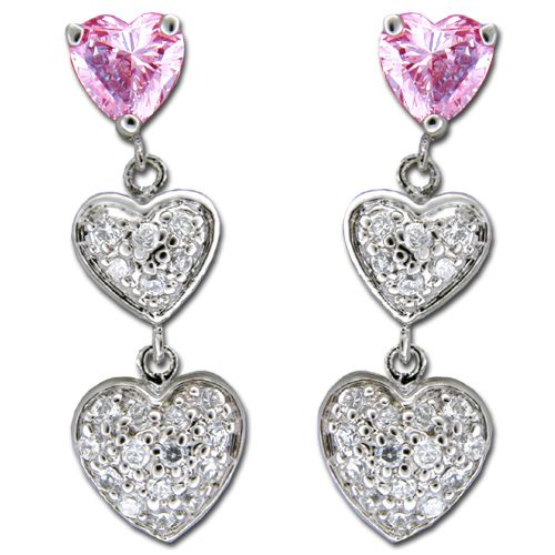 Sterling Silver Triple Heart with Clear and Pink Tourmaline CZ Drop Earrings