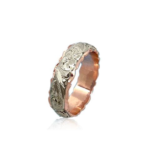 14KT Gold White and Rose Double Two Tone Hawaiian Plumeria Scroll Wedding Ring Band