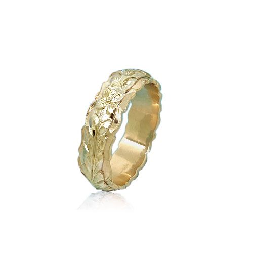 Custom hand carved in Hawaii with 14KT solid gold. Total thickness of the two layers of gold is 1.75mm and available in two different width: 6mm (1/4 in) & 8mm (3/8 in). Free Inscription included.