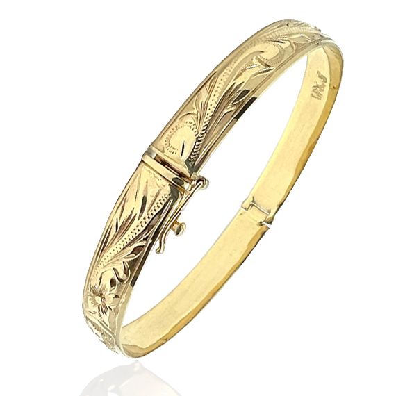 14KT Gold Custom Hawaiian Plumeria and Scroll Design Bangle Bracelet with Box Clasp