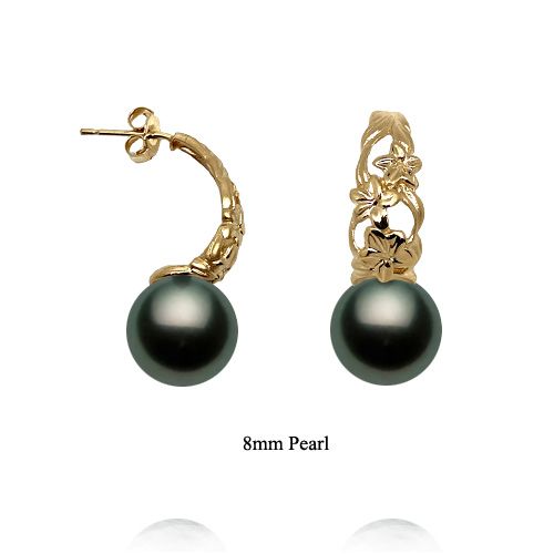 14KT Yellow Gold Plumeria Leis AAA Round Tahitian Pearl Pierced Earrings.
