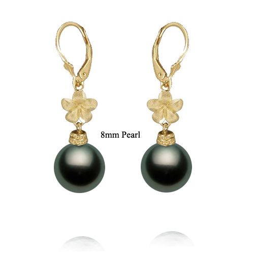 14KT Yellow Gold Plumeria Tahitian Pearl Level Back Earrings. The Plumeria is 5/16 inch in diameter. Each petal on the Plumeria flower has sand finished and diamond cut on it.