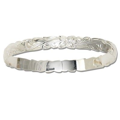 Sterling Silver Hand Carved Hawaiian Bangle. 8mm in width and over 14g in weight. There are Plumeria and Scroll designs all around the bangle. The edges are cut-out.