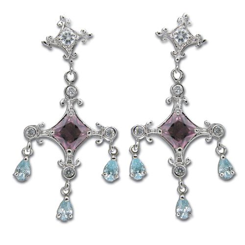 Sterling Silver Double Cross with Aquamarine Blue CZ and Tourmaline Purple CZ Earrings. These vintage design earrings have sets of Tourmaline purple CZ and Aquamarine Blue CZ. The dangling design makes the earrings look more stylish and elegant. The total length of the dangling earrings is 1 3/4". These earrings are made with sterling silver and finished with rhodium to avoid tarnishing.