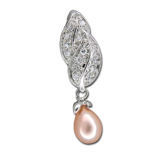 Sterling Silver Double Leaf with CZ and Dangling Fresh Water Pearl Pendant