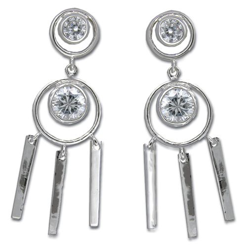 Sterling Silver Dream Catcher Design with Clear CZ Earrings. Each Earring has two circles with Diamond Clear CZ. Inspired by the Dream Catchers, each earring has three dangling silver bars attaching to the Diamond Clear CZ. The total length of the dangling earrings is 1 5/8". These earrings are made with sterling silver and finished with rhodium to avoid tarnishing.