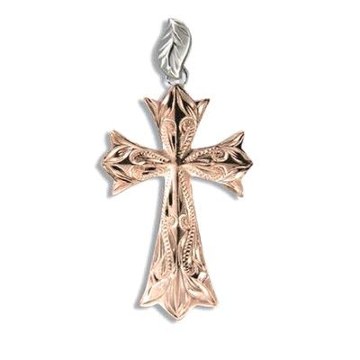 Hand Engraved Fine Sterling Silver Maile and Scroll Cross Pendant. The 1 1/2" Rhodium finished pendant is engraved with Hawaiian scroll design, and is plated with 14kt Rose gold. The Bale is also engraved with Hawaiian Maile design and finished with Rhodium. The pendant is made with solid Sterling Silver and Rhodium finished to avoid tarnishing.