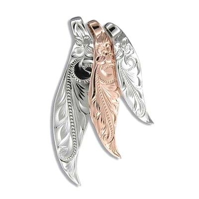 Hand Engraved Fine Sterling Silver Plumeria and Scroll with Triple Leaf Shaped Pendant. There are different sizes of the leaf pendants such as Large, Middle, and Small. The large and Small leaf shaped pendants are engraved with Hawaiian Plumeria and Scroll designs and finished with Rhodium. Only the Middle leaf pendant is plated with 14kt Rose Gold. You might wear these three leaf pendants as a set or wear it separately. The pendant is made with solid Sterling Silver and Rhodium finished to avoid tarnishing.