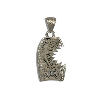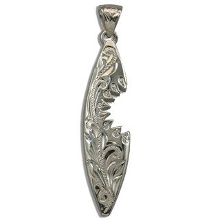 Fine Engraved Sterling Silver SHARK BITE with Bodyboard Shaped Pendant (L). The Rhodium Finished with SHARK BITE design pendant is 3/4" in width, 1 1/8" in length and engraved with Hawaiian wave design. Always appropriate and gorgeous, this pendant is a timeless classic, and it belongs in every jewelry wardrobe. The pendant is coated with Rhodium to avoid tarnishing and total length is 1 5/8".