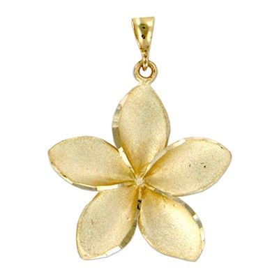 14kt Yellow Gold 26mm Hawaiian Plumeria Pendant. The Plumeria pendant is 1 1/32" in diameter. Total length is 1 3/8". Each petal on the Plumeria flower has sand finished and diamond cut on it.