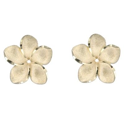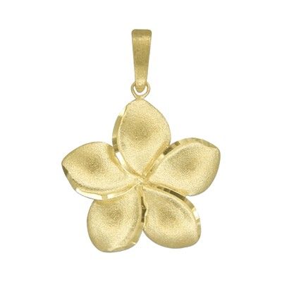 14kt Yellow Gold Hawaiian Plumeria 22mm Pendant. Pendant is 7/8" in diameter. The entire flower is sand finished with diamond cut edges on each petals.