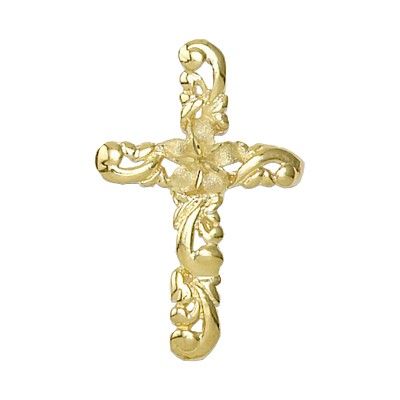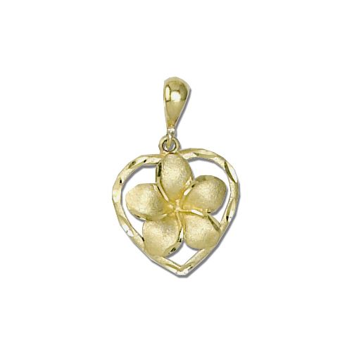 14KT Yellow Gold Plumeria with "MOM" Heart Shaped Pendant. This pendant is 3/4" in diameter. The flower is sand finished with diamond cut edge on each petal.