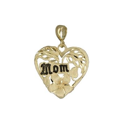 14KT Yellow Gold Plumeria with "MOM" Heart Shaped Pendant. This pendant is 3/4" in diameter. The flower is sand finished with diamond cut edge on each petal. There is a "MOM" word plated with black enamel where is shown on the Heart pendant. Total length is 1 1/16".