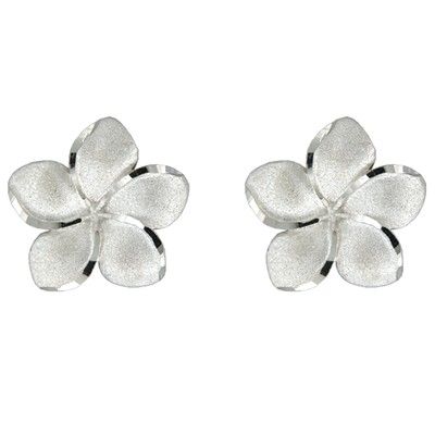14kt White Gold 18mm Plumeria Pierced Earrings. 3/4" in diameter and weight is over 4 grams. Each petal on the Plumeria flower has sand finished and diamond cut on it.