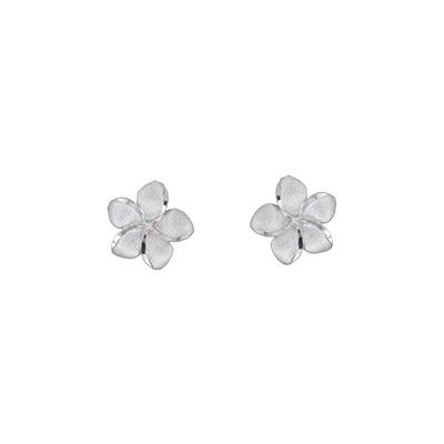 14kt White Gold Plumeria Posted Earrings. 5/16" in diameter and weight is over 1 gram. Each petal on the Plumeria flower has sand finished and diamond cut on it.