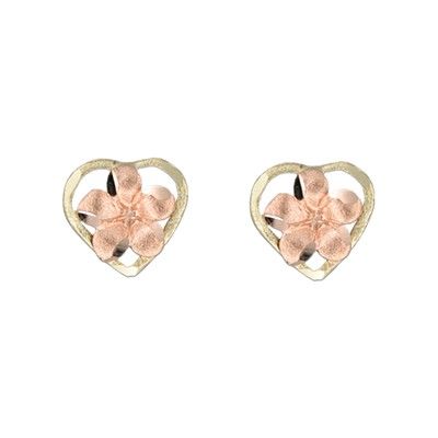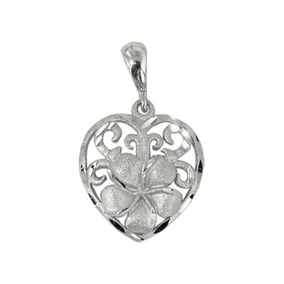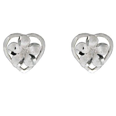 14kt White Gold Plumeria Heart Pierced Earrings. These Heart Earrings are 3/8" in width and 1/2" in length with 1/4" sand finished Plumeria flower in the center of the white gold heart. There are diamond cut on the edge of each petal.