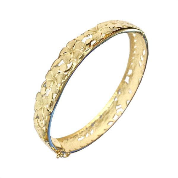 14KT Gold Hawaiian 10mm Cut-in Five Plumeria Scrolled Bangle with Box Clasp and Hinge